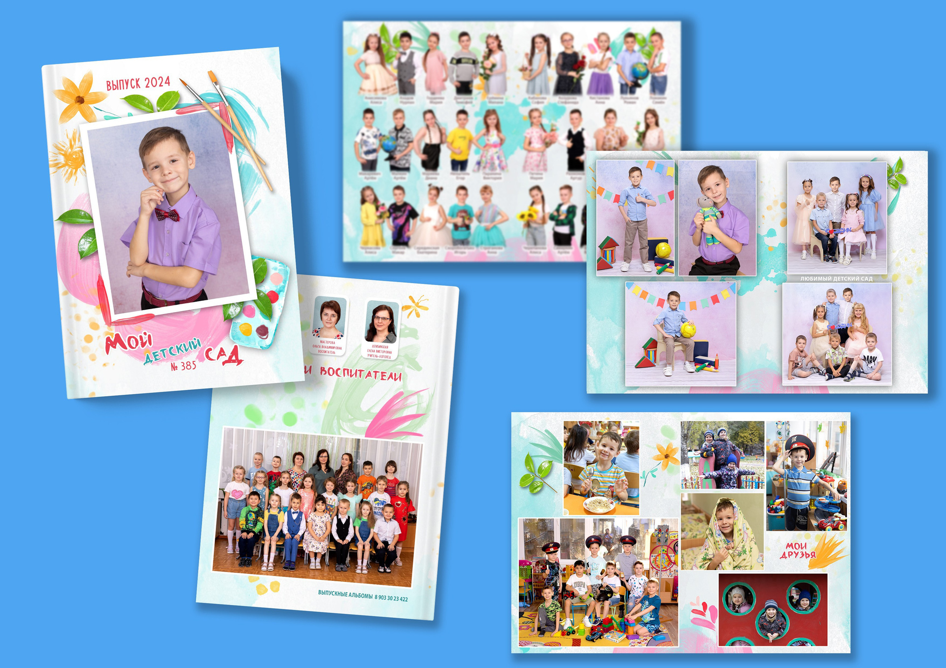 • 2 разворот: на левой странице, 3 фото с индивидуальной фотосессией ребёнка. На правой странице 2 групповые фото с вашим ребенком.